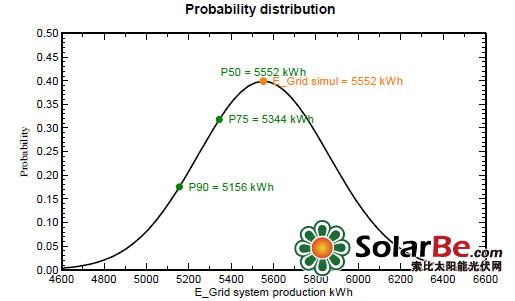 此外,在Pvsyst界面中有一项“Miscellaneous tools”,它可以对发电量的不确定性进行评估,众所周知,影响发电量的不确定性来源于多方面,比如实际获取的气象数据、灰尘遮挡、组件年衰减率等等,其中气象数据是不确定度来源的重点,因此发电量理论估算也存在一定的不确定性,各不确定因素独立地并以正态分布形式影响发电量。在引入统计学中置信率概念后,即超过一定%的可能性,发电量不再是单一数值,而是可以得到多个不同置信率水平下的发电量估算值。本例使用 PVsyst计算得出,在5.5%的不确定因素下,置信率P50发电量为5552kWh,P90为5156kWh,也就是说发电量超过5552kWh的概率为50%,超过5156kWh的概率为90%,参考图12。当不确定度越低,P90和P50的差异会缩小,发电量的不确定度对于项目投资风险管控比较重要,一般以P50 判断项目的基础收益能力,以P75 或P90 判断项目的风险水平。
