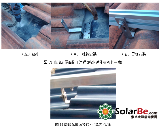 该别墅屋面琉璃瓦下面为混凝土层,整个安装施工方法和上一篇介绍的混凝土层瓦面基本一致,唯一的区别是该项目采用了挂钩和屋面进行固定,如图13为该项目所使用的不锈钢挂钩,实际施工时为了避免对屋面带来漏水隐患,挂钩和屋面之间增加一层防水橡胶材料,孔内、螺栓安装位和挂钩四周均覆盖了防水密封胶。根据施工规范(GB 50794-2012 光伏发电站施工规范),顺坡支架安装的组件与屋面之间的垂直距离需要满足通风散热间隙的要求,从施工方便角度,通风间隙不宜小于100mm,实际间隙为110mm左右(导轨高度50mm,组件铝边框厚度40mm,导轨和屋面20mm)。此外,图14所示为市场上另一种比较常见的挂钩,有的可以调节高度,有的不可以调节,导轨可以横向或竖向安装,所以使用什么样的挂钩需要根据实际工程的需要进行选择。