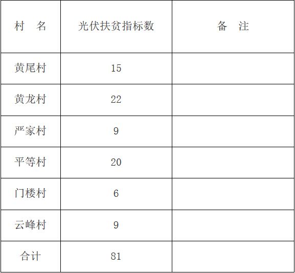 根据《关于分配岳西县光伏扶贫试点项目户用扶贫光伏电站任务的通知》(岳扶办[2015]38号)的要求,2015年首批实施对象从2013年建档立卡贫困户中筛选81户符合条件的贫困户进行安装。根据各村建档立卡贫困户数量、宣传动员力度及前期对贫困户安装意愿摸底情况,结合供电部门接入建议,将到户任务数分配到各村。(见附件)