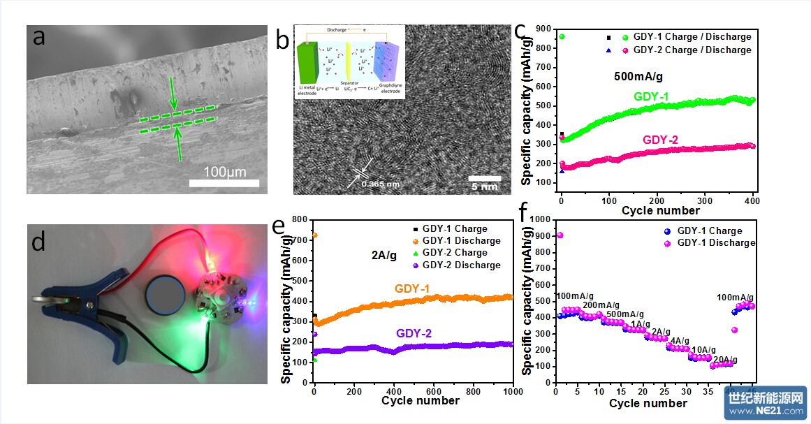 理论研究表明石墨炔是一种非常理想的储锂材料,理论容量达744 mAh g-1,多层石墨炔理论容量可达1117 mAh g−1(1589 mAh cm−3),且其独特的结构更有利于锂离子在面内和面外的扩散和传输,这样赋予其非常好的倍率性能。