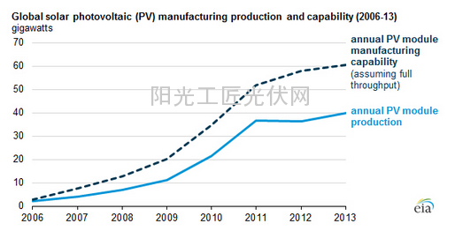 EIA报告指出,光伏组件生产的利用率在2011年达到顶峰,产量为36.5吉瓦,容量为52吉瓦,利用率达70%。2013年,虽然光伏组件产量和装机容量都略有增加,但是利用率已下降到66%。