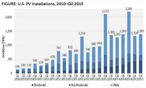 2015年二季度,美国新增光伏装机容量为1.393Gw,连续第7次单季度数字超过1GW。