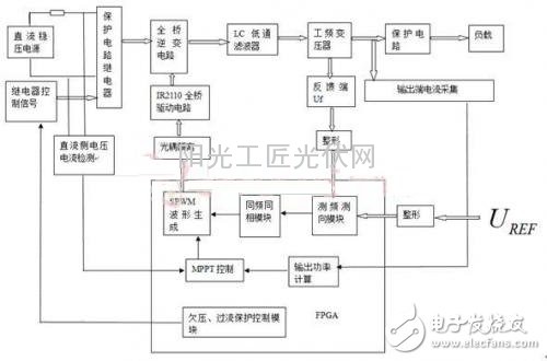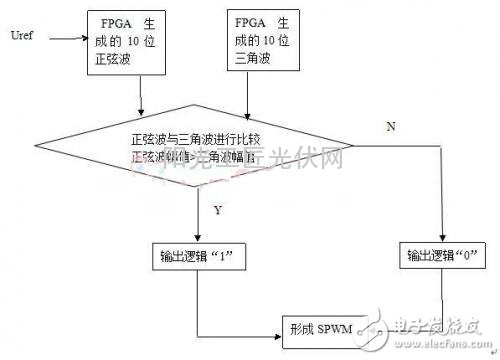 系统以FPGA为控制核心,由MOSFET管全桥逆变电路以及其IR2110对其驱动、SPWM(正弦脉宽调制)波的生成、电压电流的检测、相位频率跟踪等模块组成。其中SPWM波由在FPGA内部由软件产生的三角波的正弦波经数字比较器比较产生。通过改变正弦波的幅值来调节调制比,调节SPWM波的占空比,从而调节电压来达到功率最大。采用MPPT算法对系统进行功率最大跟踪。此系统还实现系统的欠压和过流保护,同频同相控制。