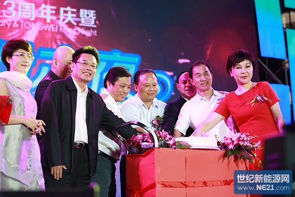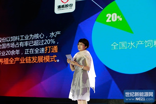 通威集团禚玉娇总裁在晚会上指出,我们隆重发布“互联网+渔光一体”行动计划,希望用科技的力量进一步改变水产养殖行业的现状,同时助力太阳能光伏新能源产业发展,该计划包括“建立全国养殖水域资源大数据系统平台”、“搭车互联网巨头共建‘渔光一体’项目管理与服务系统”、“打造‘渔光一体’高效智能水产科技园”、“与政府、养殖户共建‘渔光一体’安全水产品溯源体系”等四大方面。禚总同时指出,经过33年的厚积薄发,通威集团在农业与新能源的发展道路上披荆斩棘,取得了举世瞩目的成绩。通威股份以饲料工业为核心,全力延伸和完善水产及畜禽产业链条,水产饲料全国市场占有率已超过20%,引领行业20多年,正在全速打通绿色养殖全产业链发展模式。集团新能源产业更是成果丰硕,形成了完整的新能源产业链,在产业链上游,作为位居我国前三位、西南地区最大、国内唯一一家循环经济产业链的多晶硅生产企业,通威旗下永祥股份已形成多晶硅1.5万吨产能,在成本控制与质量方面达到国际一流水平,为产业链中下游提供了高性价比的优质硅料;在产业链中游,通威太阳能深度切入太阳能发电核心设备和产品的研发、制造和推广。其中,在安徽合肥拥有全球单体规模最大的太阳能电池生产基地,已实现2000MW电池片产能,年底将达到2400MW电池片产能,产能利用率高达120%,已成为全球出货量最大的多晶硅电池片生产单厂,生产的太阳能电池片平均转换效率超过18%,各项技术指标已达世界先进水平,目前通威集团与台湾昱晶能源达成战略合作,结合昱晶能源1.8GW电池产能,一跃成为世界第一;在产业链终端,通威拥有发展分布式光伏的独特优势,大力发展家庭屋顶光伏,并与现代渔业相结合,打造“渔光一体”模式。目前,通威已在全国各地建立起了商业或家庭式光伏发电及“渔光一体”示范电站,优质而清洁的光伏电力正源源不断地惠及千家万户,从而最终成为全球领先的绿色农业和绿色能源供应商。