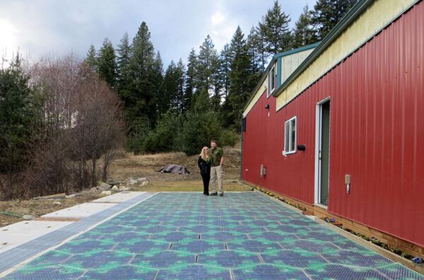 这对来自爱达荷州的夫妇正站在太阳能路公司的概念原型前。
