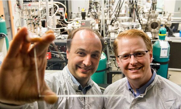 Vladimir Bulovic(左)和Miles Barr(右)两位企业家正在展示透明的太阳能电池。这种电池有望安装在手机、窗户等日常用品上。