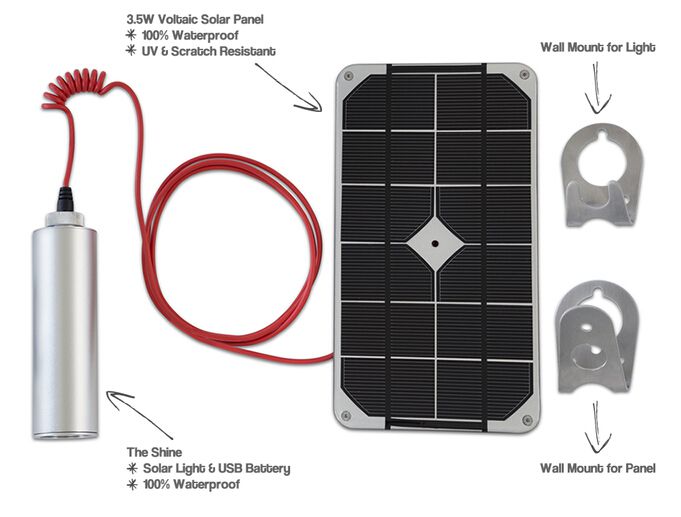 一整套Shine太阳能充电宝手电筒的零售价为85美元,包括一块3.5w太阳能板、一支Shine手电筒、2个挂墙支架和一条142cm长的防水悬挂电缆。如果已经有太阳能板,用户还可以单独购买零售价为55美元的Shine手电筒,还包括一个USB转换头、一个挂墙支架、一条防水悬挂电缆。