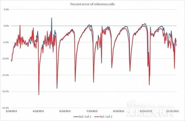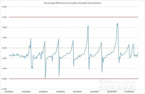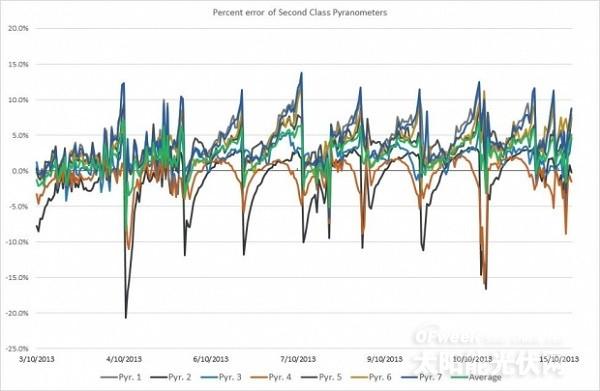 图1、2显示,数个二等标准辐照仪的百分比误差在+-10%,极大误差达到了20%。这种程度的误差确实非常有争议,也许这些辐照数据已经不适合使用。另外,各二等标准辐照仪之间也有显著的差异。结果表明需要后续测试、维护甚至是对这些二等标准辐照仪进行校准以维持其数据质量水平。