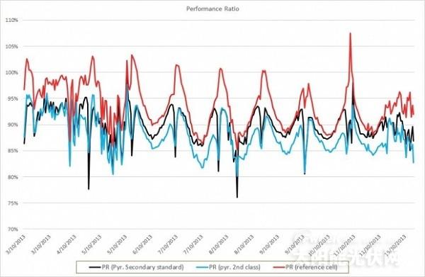 下一页>当使用辐照数据计算系统效率时,使用准确辐照数据的重要性就显而易见了。带入不同的辐照数据计算系统效率的结果比较详见下图4: