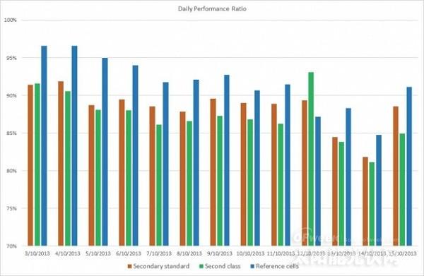 系统效率的计算差异非常明显。而且使用基准电池组测得的辐照数据计算所得系统效率大于100%,这显然无法接受。