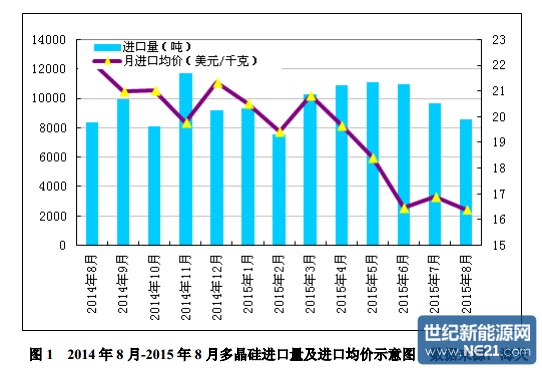 图 1 2014 年 8 月-2015 年 8 月多晶硅进口量及进口均价示意图 数据来源:海关
