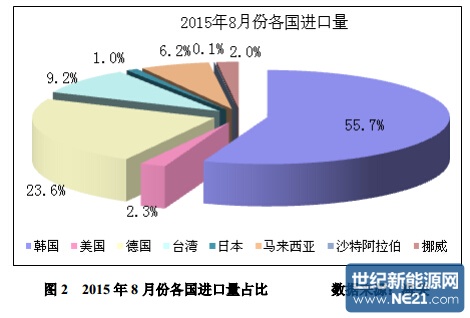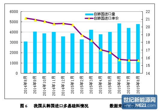2015 年 1-8 月份累计从韩国进口多晶硅量为 33198 吨,同比增加 64.2%; 1-8 月份累计进口均价为 17.18 美元/千克,同比降幅为 18.7%。