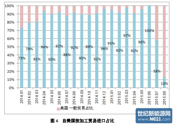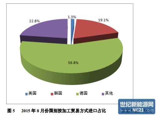 二、按贸易方式来分,2015 年 8 月份我国加工贸易等方式进口 1926 吨, 占比为 22.5%。1-8 月份累计按加工贸易方式进口 42185 吨,占累计总进口量的 53.9%。分国别具体看来:8 月份自韩国按加工贸易方式进口多晶硅 368 吨,占 自韩国进口总量的 7.7%,1-8 月份累计自韩国按加工贸易方式进口 13346 吨, 占累计总进口量的 40.2%,即便 2.4%的税率都要通过加工贸易方式规避;8 月 份自美国按加工贸易方式进口多晶硅 25 吨,占自美国进口总量的 12.5%,8 月 份从美国进口量之所以能够大幅减少,与暂停加工贸易“58 号文件”顺利实施 有必然联系,1-8 月份累计自美国按加工贸易方式进口 10732 吨,占比 92.3%; 8月份自德国按加工贸易方式进口多晶硅1094吨,占自德国进口总量的54.1%, 是 8 月加工贸易占比最高的国家,德国 8 月份的加工贸易量是其在保税仓储的释放延后所致,1-8 月份累计自德国按加工贸易方式进口 12377 吨,占比 58.3%。