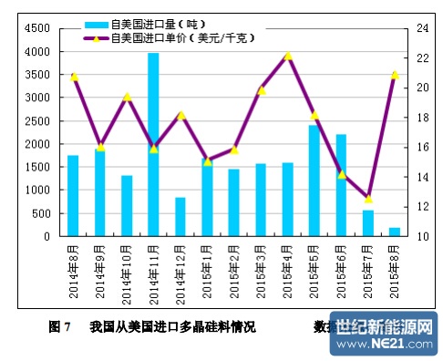 2015 年 1-8 月份累计从美国进口多晶硅量为 11627 吨,同比减少 11.3%; 1-8 月份进口均价为 17.21 美元/千克,同比降幅为 12.8%。