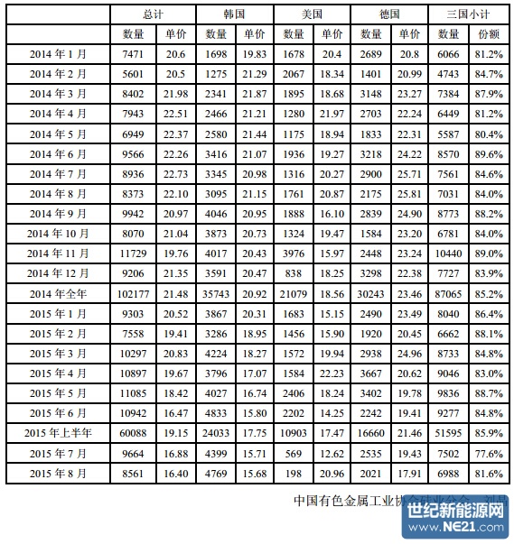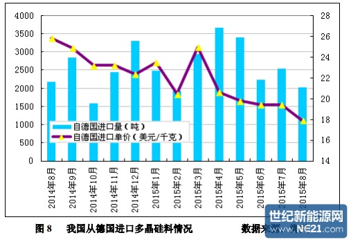 2015 年 1-8 月份累计从德国进口多晶硅量为 21215 吨,同比增幅为 5.7%; 1-8 月份累计进口均价为 20.88 美元/千克,同比降幅为 11.1%。