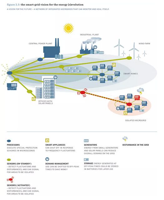 电网——连接电站同消费者的系统——可以处理大量的可再生能源。在目前使用的电网模式上增加风能和太阳能不是解决之道。我们所需要的是整个能源系统的渐进转换,以适应现代能源的生产和消费。
