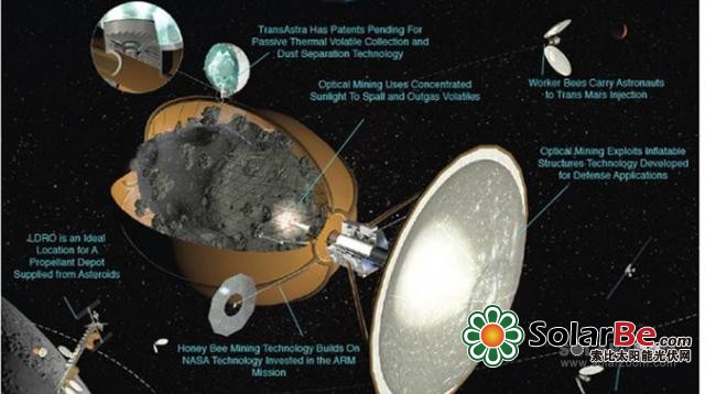 该方法的特点是可收集小行星上的水资源,将小行星装入一个巨大的充气装置中,通过直接加热太阳能提高充气装置内部的温度。同时集中使用太阳能加热可在小行星表面钻洞,破坏小行星的坚实结构,有利于后续开采小行星。当飞船到底目的地后,小行星开采的前处理工作也基本完成了。首席研究员Joel Sercel估计一次收集120吨的液态水,同时还有其他蒸发出来的物质。