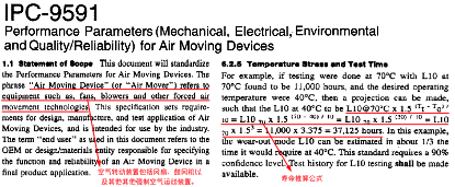 风扇寿命主要由轴承内润滑油的含量、种类以及使用环境决定。风扇寿命可通过不同的技术方法测试得到。IPC-9591《空气转动装置的性能参数(机械,电气,环境和质量/可靠性)》标准中声明了空气转动装置包括风扇、鼓风机以及其他强制空气运动装置,并详细给出了空气转动装置的寿命测试方法:即通过在高温下加速试验得到的实测寿命,利用转换公式推算出正常工作温度范围下的使用寿命。