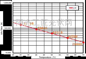 IPC-9591标准中的推算公式为 ,其中 为加速测试时的环境温度, 为在 温度下的实测寿命, 为需折算到环境温度, 为推算出的 温度时的使用寿命。笔者通过咨询国际几大主流风扇厂家,如NMB、EBM和SANYO,大都采用IPC-9591的标准来给出各自风扇产品的寿命曲线。图5所示为某国际主流风扇厂家利用IPC-9591标准的推算方法给出的寿命曲线及数据。