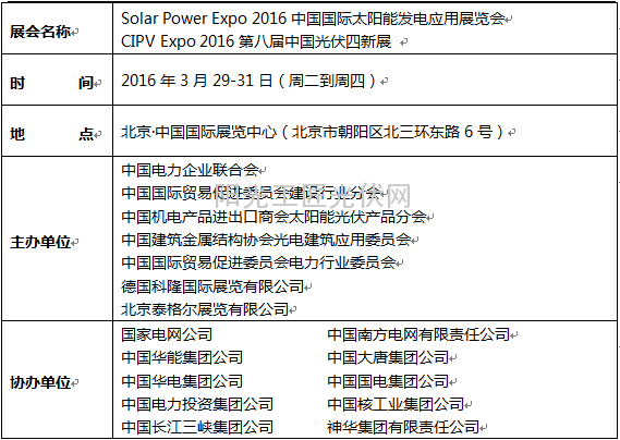 “中国光伏四新展(CIPV Expo)+ 中国光热四新展(Solar Thermal & CSP China)“2016年起合并升级为“中国国际太阳能发电应用展览会(Solar Power Expo)”,是中国唯一由终端用户行业组织主办的太阳能发电应用展览会。将于2016年3月29-31日北京.中国国际展览中心(朝阳区北三环东路6号)隆重召开。展览会服务方向更加明确,定位服务于行业终端太阳能发电应用, 致力推动太阳能发电技术与应用,针对集中式、分布式、微电网、户用式等多方面向大众展示,搭建制造业与终端用户沟通交流平台。