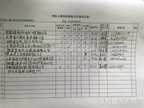(颖上县“光伏扶贫”招标会投标人签到及投标文件递交记录)