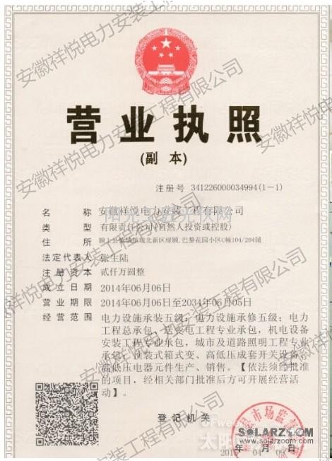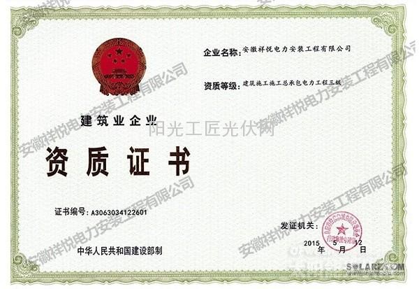 既然通过官方找不到这家“安徽祥悦电力安装工程有限公司”和“五洋电力建设股份有限公司”,小编开始求助度娘。在“安徽祥悦电力安装工程有限公司”条目下找到4340个结果,剔除不相关的信息,有用的只有两条,一条是“安徽祥悦电力安装工程有限公司”家的官网,一条是百度百科,也就是说这两条信息都是“安徽祥悦电力安装工程有限公司”自己添加出来的。在“安徽祥悦电力安装工程有限公司”官网中,小编赫然发现这样的字句“安徽祥悦电力安装工程有限公司位于安徽颖上城北新区,于2014年6月6日注册成立,注册资金二仟万元”,2015年5月12日才获得“建筑施工施工总承包电力工程三级”证书。这样的条件是如何通过招标单位“电力工程施工总承包三级及以上资格”、“提供三年公司财报”、“太阳能光伏企业(光伏产品生产企业或光伏工程施工企业)”考核并能最后中标的?