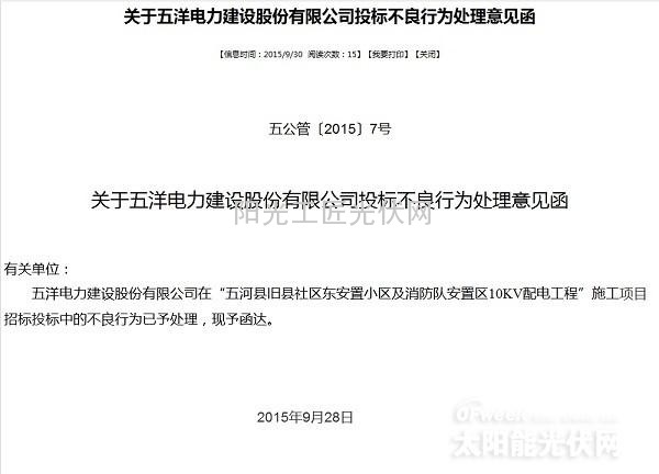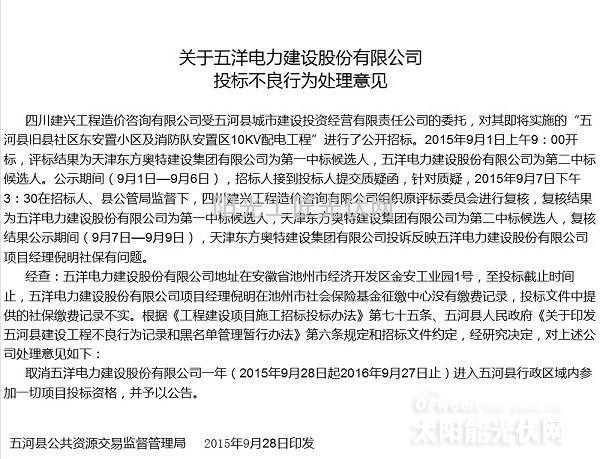 “五洋电力建设股份有限公司”的搜索结果就更有意思了,就开标前2天,2015年9月28日,蚌埠公共资源交易网曝出一条跟“五洋电力建设股份有限公司”有关的公告,公告声称“五洋电力建设股份有限公司在“五河县旧县社区东安置小区及消防队安置区10KV配电工程”施工项目招标投标中的不良行为已予处理”,也就是说此“五洋电力建设股份有限公司”之前就有不良投标记录,但是根本没有影响到此次竞标,不仅如此还成为最后的大赢家。