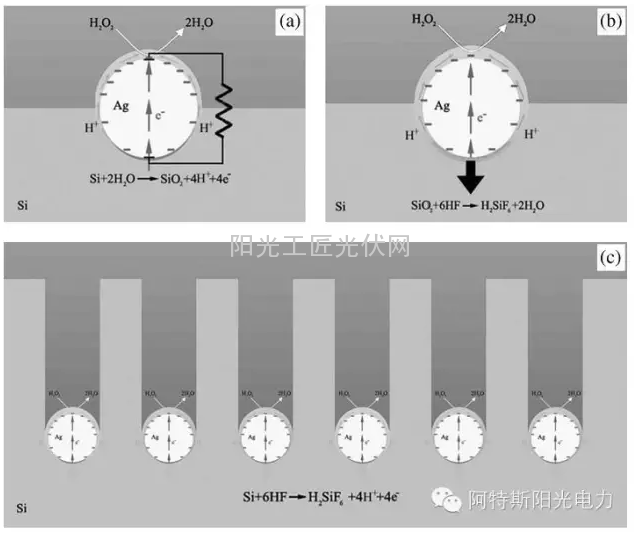 另外一种可大规模产业化的黑硅技术是湿法黑硅技术。早在2006年,德国的Stutzmann小组即提出了金属催化化学腐蚀的概念并在实验室进行了初步的研究;直到2009年,美国国家可再生能源实验室(NREL)的Branz博士提出了全液相黑硅制备方法,将湿法黑硅技术朝产业化方向又推进了一步。但是,他们一直未能解决好黑硅表面钝化难题,使得湿法黑硅技术一直停留在实验室阶段。湿法黑硅技术基本原理如图2所示,采用 Au、Ag等贵金属粒子随机附着在硅片表面,反应中金属粒子作为阴极、硅作为阳极,同时在硅表面构成微电化学反应通道,在金属粒子下方快速刻蚀硅基底形成纳米结构。