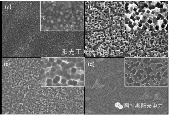 阿特斯开发的湿法黑硅技术,可以实现不同类型的纳米绒面。这些绒面包括:纳米正金字塔、纳米倒金字塔、纳米柱、纳米凹坑等,如图3所示。对于不同类型的纳米结构,其光学特性以及电学特性是不同的。光学特性主要是封装后光学多次反射的角度和路径不同,从而导致组件端光学增益的不同;电学特性主要是不同纳米结构的尺寸以及表面积不同,从而导致表面钝化的不同,进而影响最终电池的电性能。湿法黑硅的优势就在于,它可以调控不同类型的纳米微结构,通过光学和电学性能上的匹配,实现湿法黑硅组件功率的最大化。