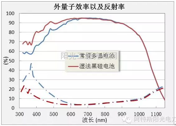湿法黑硅技术是通过提高电池的短波响应来提高光电流。图4是典型的湿法黑硅电池与常规多晶电池的量子效率以及反射率曲线。