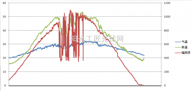如前所述,光伏组件运行后的温度,会高于环境温度的,但具体高多少尚无定论。下图是一张组件温度和环境温度的变化图。