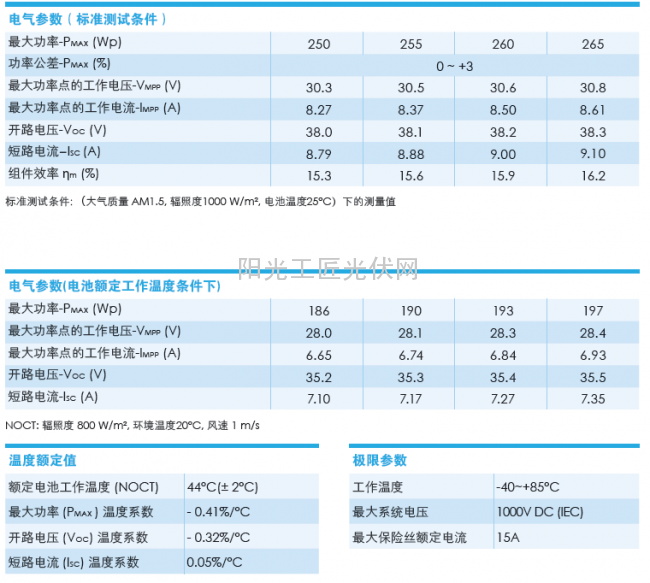 例1:以天合260W多晶硅组件为例,假设当地极端低温为-30℃;逆变器最大开路电压为1000V,MPPT电压在420~850V。