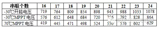 可以看出,若逆变器最大开路电压为1000V,MPPT电压在420~850V时,则,开路电压:N1≤22;MPPT电压:17≤N2≤23,最终串联个数取22个。