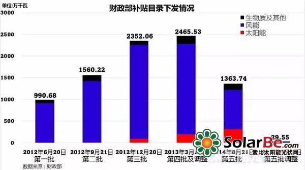 不多说直接上图,这是最新的补助目录发放情况,若不计2015年7月下发的第五批调整目录,补助目录已经1年没有更新。从装机容量来看,已列入目录的太阳能及风能项目合计8118万千瓦,然而截2015至6月末,太阳能及风能项目合计14069万千瓦,意味着约有5000多万千瓦的项目因没有列入目录而拿不到补贴。(全国并网风电装机容量10491万千瓦,全国光伏发电装机容量3578万千瓦,光伏电站3007万千瓦,分布式光伏571万千瓦。)