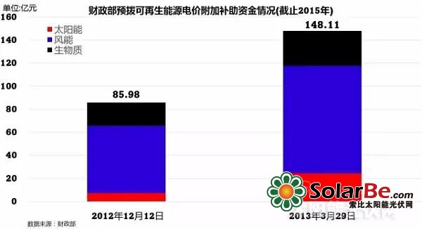 这要我国可再生能源基金说起,2006年起我国根据《可再生能源法》,国家规定从销售电价中征收可再生能源电价附加作为可再生能源发展基金,征收标准0.1分/度。2011年财政部依据可再生能源法下发了《可再生能源发展基金征收使用管理暂行办法》,文件规定先由各级电网从全国范围内(不含西藏)的销售电量中(不含农业生产用电)征收0.8分/度的可再生能源电价附加,再由各级财政向电网收缴电价附加收入,然后直接全额上缴中央国库。不过,可再生能源发展基金规模难以与迅速增加的补贴需求相匹配,据国家发改委官方数据,截止2011年底基金缺口达107亿元。2013年国家发改委再次发文宣布将向除居民生活和农业生产以外的其他用电征收的可再生能源电价附加标准由0.8分/度提高至1.5分/度。