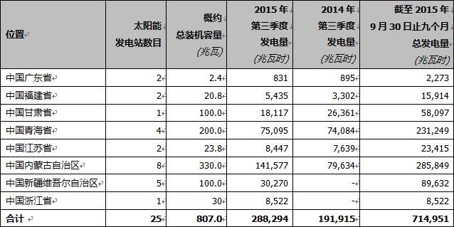 此外,数据显示,截至2015年9月30日,本公司及联营公司实益拥有的光伏电站今年累计发电量达约7.15亿度。截至9月30日,本公司及联营公司实益拥有25个光伏电站,总装机容量为807兆瓦,第三季度发电量快速增长主要受益于期间完成收购四个光伏电站的股权,总装机容量为170兆瓦。