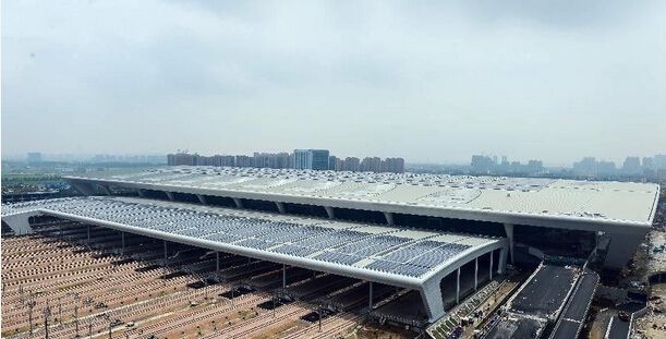 杭州东站是全国九大省会城市巨型车站建设工程的“收官之作”,该车站于2013年7月1日投入使用,总建筑面积达113万平米,站内汇集高铁、普铁、专线、地铁、磁浮、公交、水上巴士等多种交通方式和配套服务设施于一体并可实现立体无缝交通换乘,是亚洲超大型交通枢纽之一。作为老站原址改扩建,在全国已建成的大型高铁站中,是最晚设计、最晚建成的,这也使得它有可能在设计上采用更新的理念和技术,屋顶采光系统和屋顶光伏发电系统的设置,能充分体现最新的环保理念,同时也使之成为我国已并网的最大单体光电建筑之一。站在杭州火车东站站房屋顶,一块块光伏组件像大型地砖一样整齐划一排列着,铺设面积比11个足球场还要大,原本白色的建筑屋面,超过80%被蓝色覆盖,一眼望去颇为壮观。