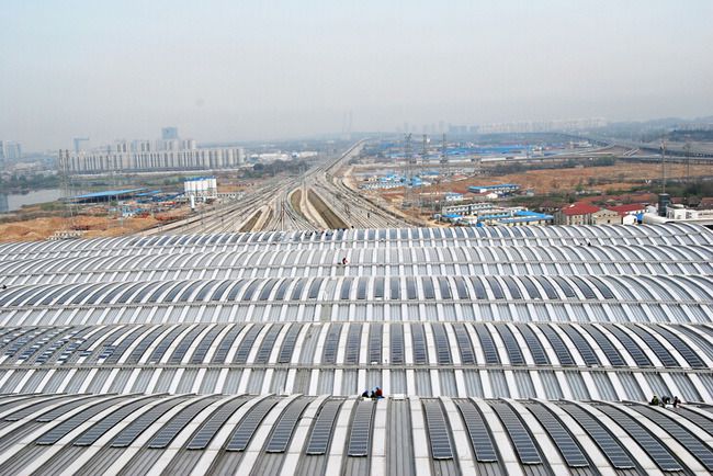 武汉火车站不仅被誉为“最美”,同时也是我国光电建筑在站房建设应用中璀璨的明珠。首先,武汉火车站动工较早,其太阳能光伏并网发电项目是铁道部未来发展各火车站屋面光伏系统的重要的示范项目。其次,该项目是当时湖北省内体量最大和装机功率最大的光电建筑一体化项目。其三,在大型建筑物上采用光伏系统分布式结构,将发电的电池组件矩阵分别设置在车站九片屋檐上,而逆变、配电部件集中安装在火车站内部,这对系统结构设计和功能定位具有非常高的要求。其四,需要克服施工环境恶劣和众多的影响因素,系统主体建设施工基本都属于高空作业,加上屋面奇异的造型更是增加了施工难度,同时还要应对诸多气候天气等自然因素,以及确保客运部门正常营运等等,这些都为以后的站房光伏系统建设提供了非常宝贵的经验。其五,作为湖北省太阳能光伏发电重点示范工程,根据现场试运行阶段数据换算显示,工程投运后年上网发电量为204.8万度,每年可以减少2041.856吨二氧化碳的排放,减排557.056吨煤,这已充分显现出光电建筑所带来的社会效益与经济效益。