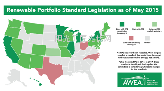 美国是第一个实行可再生能源配额制RPS的国家,也是实行可再生能源配额制RPS较为成功的一个国家。截至2015年5月,其实施RPS的州和地区分布如下图。