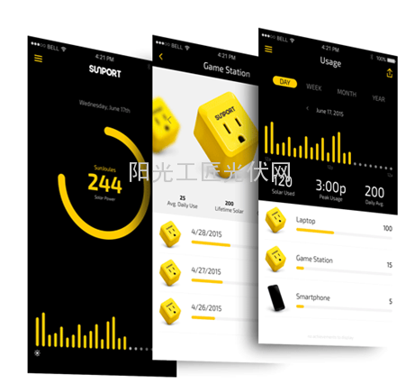 SunPort使用标准的三孔插口,可用于1200w的负荷,具有板载功率测量、处理、存储和通信能力。其使用起来非常简单,只要将SunPort插到三孔插座上,然后把其他电器的插头插到SunPort上即可。同时,可以通过手机客户端监测通过SunPort的电量。