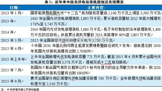 发展清洁能源是国内能源结构调整的重要方向,光伏作为重要清洁发电资源近年来发展势头良好,2015年上半年提前完成光伏“十二五规划”3,500万千瓦装机的规划。同时,2014年我国向《联合国气候变化框架公约》秘书处提交的自主贡献文件中承诺,2020年我国光伏装机总量将达到100GW(1亿千瓦),整体光伏电站装机提升空间仍较大,2016~2020年年均装机规模平均约1,000万千瓦,目前相关主管部门正在制定十三五规划,考虑到目前的装机速度和规模,十三五规划光伏装机目标或将大于对2020年100GW光伏装机的承诺。长期来看,光伏作为重要清洁电源发展空间广阔,未来长期增长仍可持续。