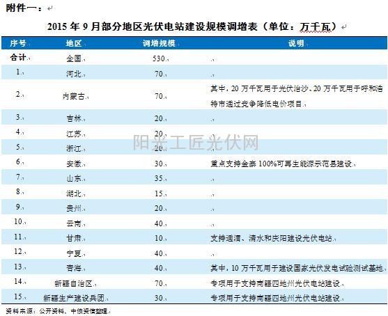 9月末,国家能源局发布《调增部分地区2015年光伏电站建设规模的通知》(以下简称《通知》)调增2015年光伏电站建设规模530万千瓦,较3月公布的1780万千瓦的目标增加近30%。《通知》明确,新增光伏电站建设规模主要用于支持光伏电站建设条件优越、已下达建设计划完成情况好以及积极创新发展方式的新能源示范城市、绿色能源示范县等地区建设光伏电站。合计共14个省份和新疆生产建设兵团获得调增计划,其中光照条件优越的西北地区、已下达建设情况完成较好的内蒙古等地以及安徽等建设新能源示范城市的地区获得调增规模较大。
