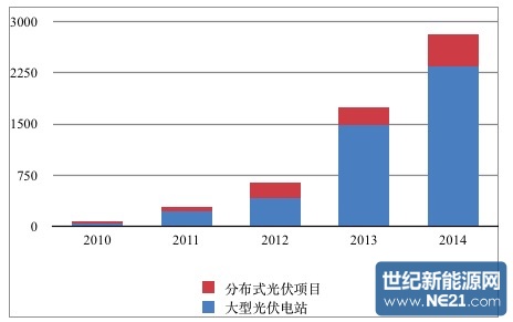 可以看出,大型地面光伏电站目前仍然是主流。然而,我们也不能忽视, 2014年分布式的年新增装机量是2010年的10.6倍!前文提到,我们之所以相信光伏未来会比风电更具发展前景,最大的优势在于光伏受到的制约最小。当然,是分布式光伏!