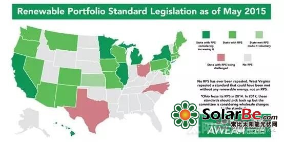 美国是第一个实行可再生能源配额制RPS的国家,也是实行可再生能源配额制RPS较为成功的一个国家。截至2015年5月,其实施RPS的州和地区分布如下图。