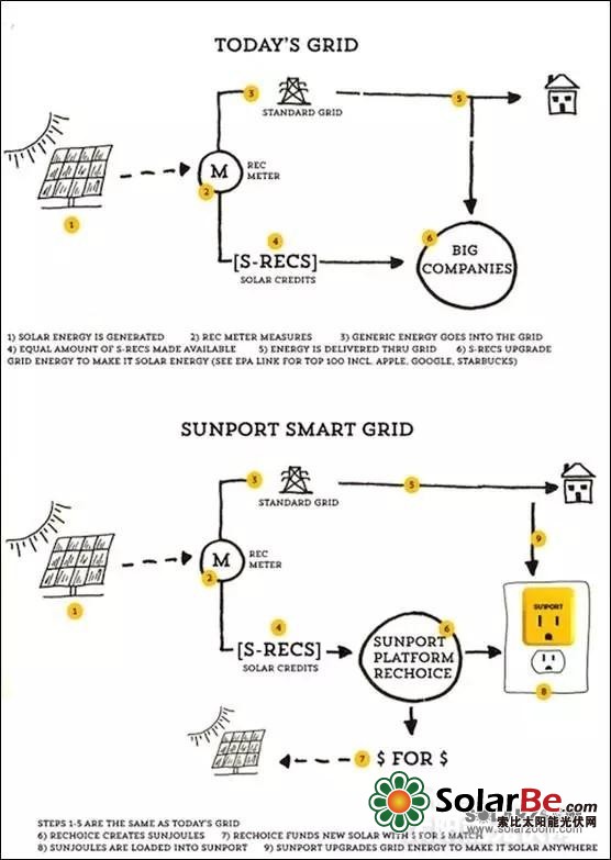 针对太阳能发电,有一种专门的可再生能源证书REC,即Solar Renewable Energy Certificates- SREC。当你通过SunPort使用公用电网上的电时,不论这种电是何种来源,配套的APP会“指定”所用的电为太阳能发电,这时需要用户购买SREC。当你购买了1个SREC,就意味着你可以使用1兆瓦时由太阳能所发的电,而你购买SREC所支付的钱会直接付给可再生能源的发电企业。一个SREC足够普通家庭整整一个月的电能使用,为此SunPort还和一家名为ReChoice的非盈利组织合作,把SREC分割为许多份,每一份称之为1 SunJoule,对应1千瓦时,也就是一度电的电能。因此,通过这种使用SunPort方式,虽然没有改变你的用电方式,却间接地支持了新能源的发展及环境保护。