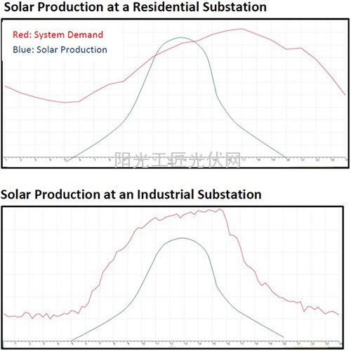 图1:光伏发电(蓝线)与电力需求(红线)的比较。上:住宅附近的变电站(住宅需求与光伏发电不均衡),下:工厂附近的变电站(工厂需求与光伏发电均衡)(出处:Steele-Waseca Cooperative Electric)