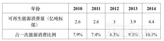 中国作为负责任的大国,一直致力于可再生能源的发展,可再生能源在能源消费中的比例逐年增加。下表为2010~2014年我国可再生能源的消费量和占能源消费中的比例。