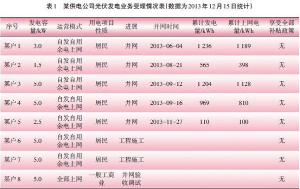 对于县级家庭户光伏发电并网选用自发自用余量上网方式,电能计量方式需设置一块地市公司统计发电量电能表,一块地市公司统计上网电量的计量电能表,一块县公司统计下网电量计量电能表,根据容量情况选择安装计量用互感器,并配置计量箱柜。同时分别为接入供电公司和光伏发电管理部门还需配备相应的用电信息采集终端,作为电能量计量和电价补贴依据。表1为某供电公司光伏发电业务受理情况。