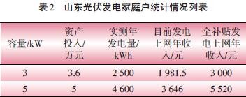 对5kW用户3和用户4进行估算,其平均年发电量4600kWh,据了解,用户3和用户4前期总投入平均估算为5万元(不考虑其年维护费用和大修费用)。对2种容量的用户实际估算,按照目前山东光伏发电上网电价0.7926元kWh,全补贴1.2元/kWh进行统计列表2。
