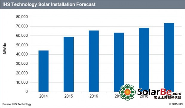 2015年初,IHS预计,全球太阳能光伏市场需求将突破57.3GW,较2014年提高30%。